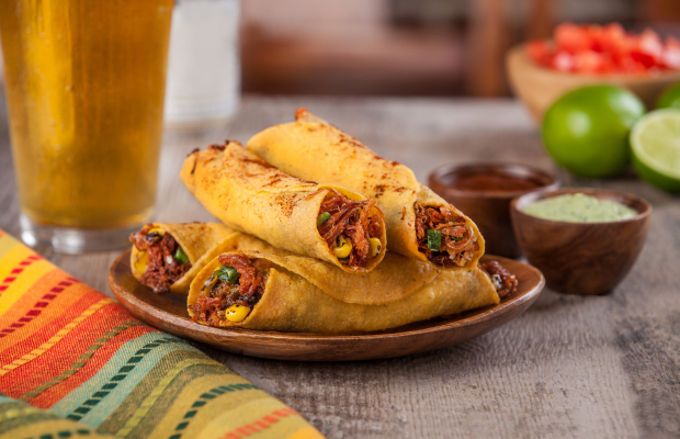7. Hell olje i en stor panne, cirka 2 centimeter opp på kanten. Varm oljen og stek en omgang «flautas» om gangen mens du hele tiden snur dem til de er gylne og sprø.